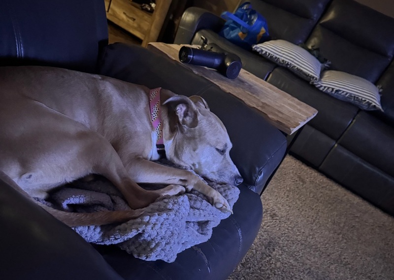 She is a big cuddler and would love to sleep in bed with you. She also does fantastic in a crate. She is potty trained and knows some basic commands.
